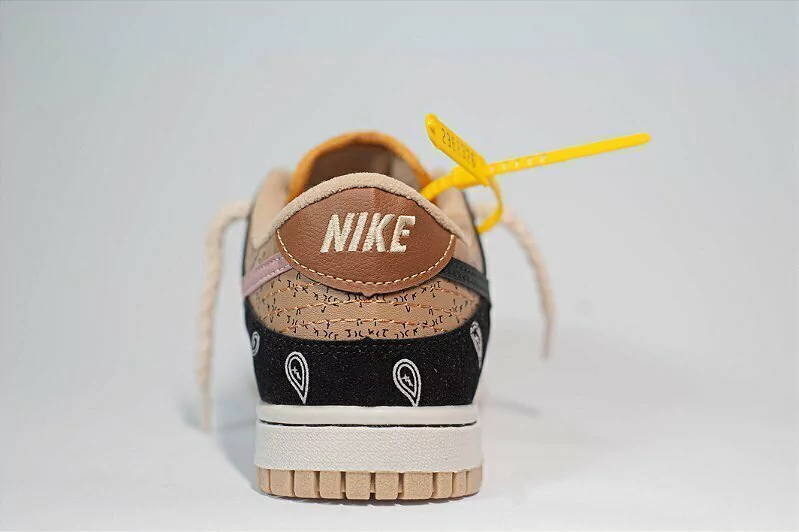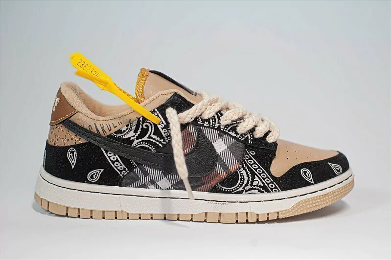 A popularidade do Nike Dunk está de volta a todo vapor e o Nike SB Dunk Low x Travis Scott elevará notavelmente a demanda do modelo Dunk ainda mais. Exibido em seu estado original, o modelo exibe uma sobreposição estampada em paisley, no entanto, uma gravura de elephant cement e estampas xadrez ficam escondidas por baixo e é revelada quando usada ou arrancada. Além disso, o texto bordado ao redor da gola, cadarços no estilo corda e o logotipo Cactus Jack de Travis Scott nas línguas completam o design.